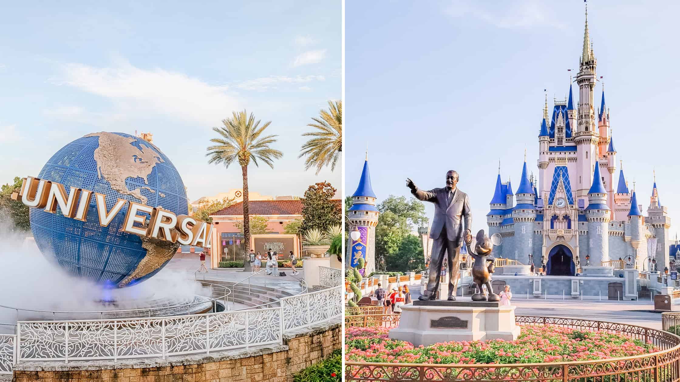 A split image shows the Universal Studios globe fountain on the left and the statue of Walt Disney and Mickey Mouse in front of Cinderella Castle at Magic Kingdom on the right.
