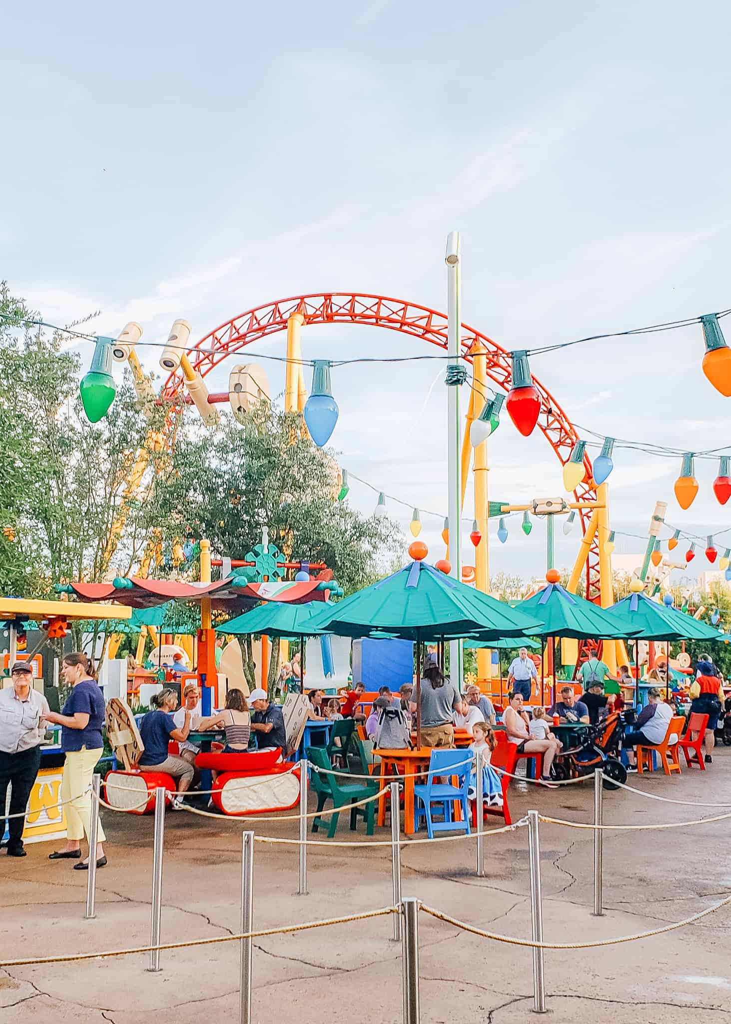 Woody’s Lunch Box is located in Toy Story Land next to Toy Story Mania! It’s such a fun spot, with toy-themed tables (like the seats made from a wedge of Babybel cheese). All seating for this one is outside, but most tables have umbrellas.